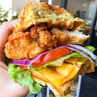 The Original Doublewide has golden fried chicken breast, applewood smoked bacon, American cheese, lettuce, tomato & onion, between a bacon waffle, and served with a side of sawmill gravy. All sandwich boxes have 6 individually wrapped 1⁄2 sandwiches. Add a side to make it a medium/light meal for 6 people. *The picture is of the regular menu items, not the catering version.